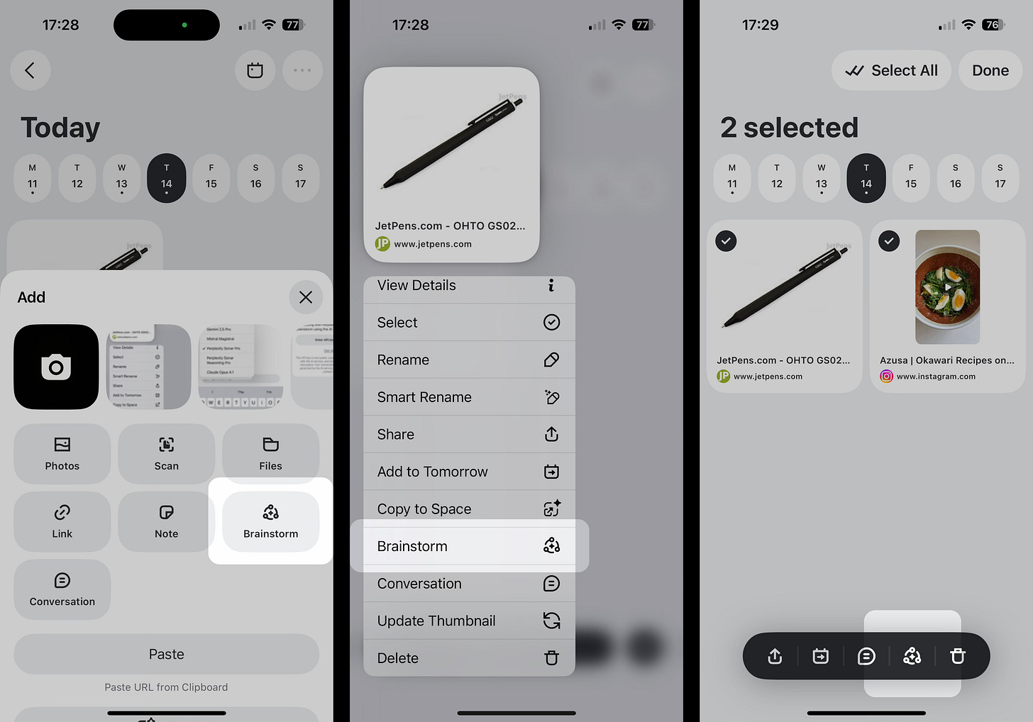 Choose “Select items” in a space, select several, then tap the Brainstorm icon at the bottom to ask Perplexity about all of those items